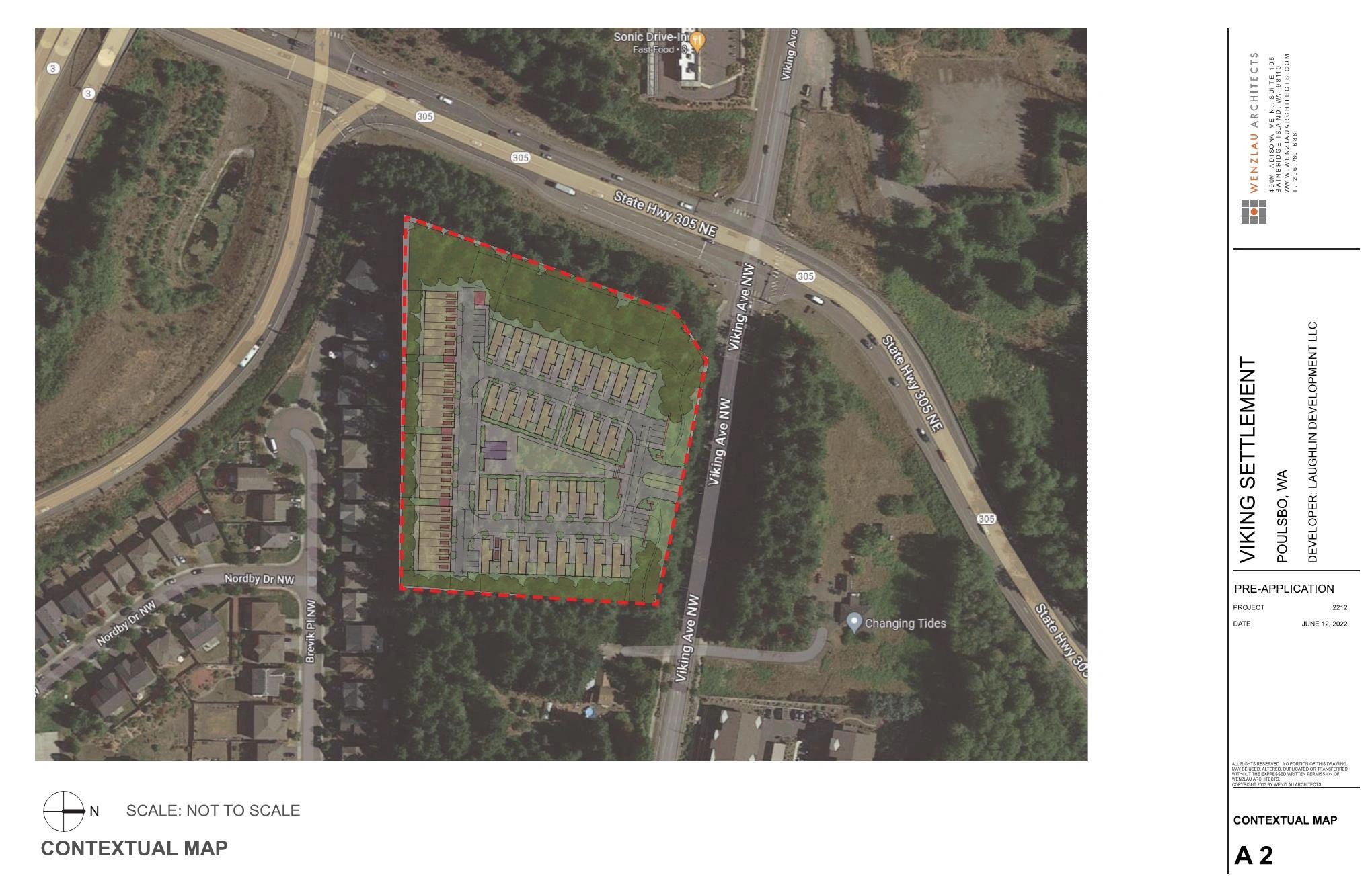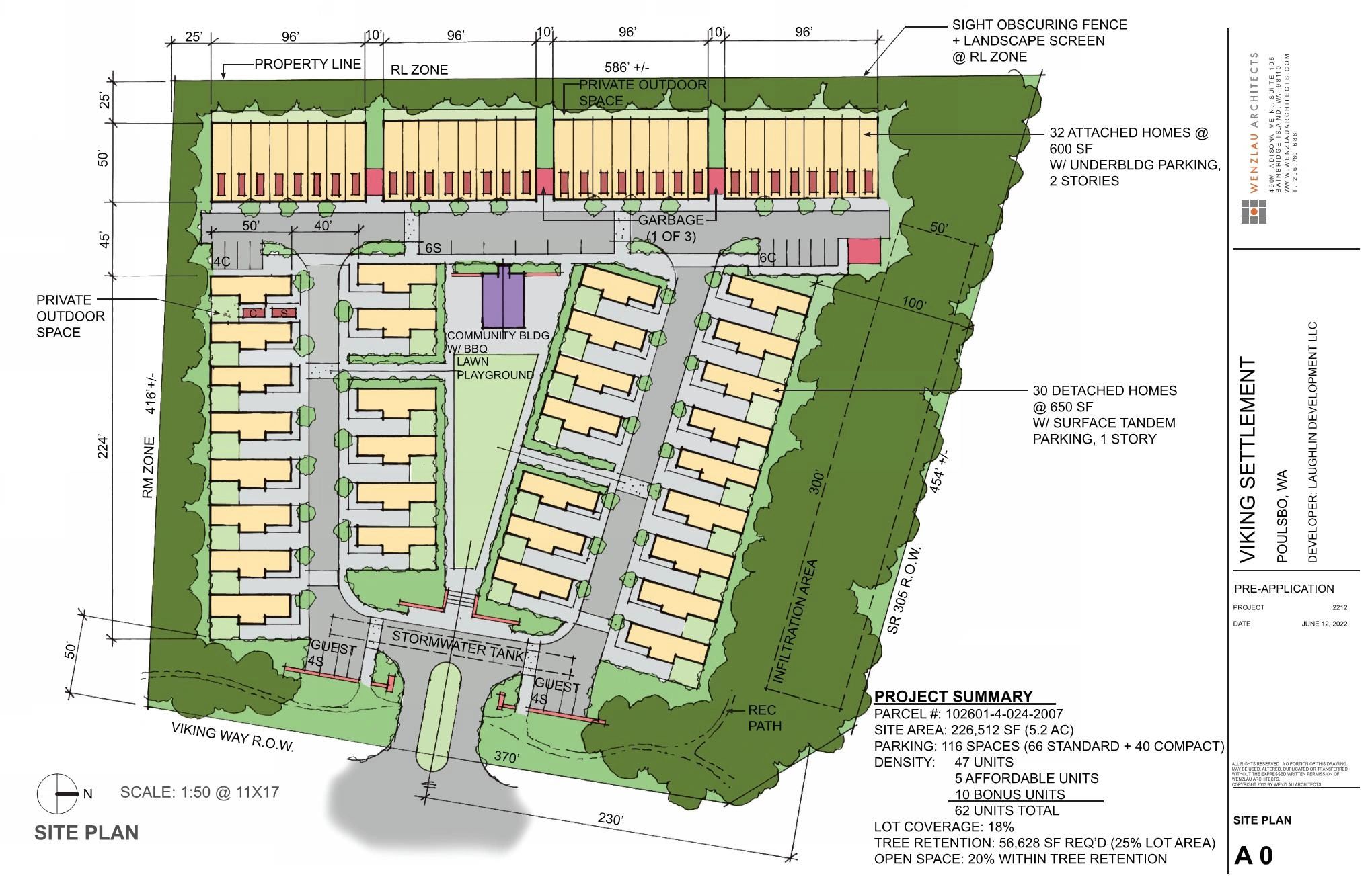 The program includes detached small footprint homes terraced into the sloping site and a row of townhouses at the upper portion of the site. The small home sizes (600-650sf) are intended to offer an alternative in the marketplace for small households seeking an alternative to apartment style living.